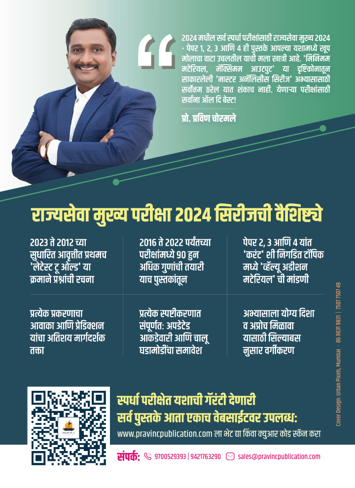 राज्यसेवा मुख्य परीक्षा ही सिरीज येणाऱ्या सर्व स्पर्धा परीक्षांसाठी उपयुक्त ठरेल या हेतूनेच तयार केली आहे. म्हणूनच सर्वाधिक अधिकाऱ्यांनी व विद्यार्थ्यांनी नावाजलेली अशी ही महाराष्ट्रातील एकमेव सिरीज आहे. विशेष म्हणजे 2016 ते 2022 पर्यंतच्या परीक्षांमध्ये 90 हुन अधिक गुणांची तयारी याच पुस्तकांनी केली आहे. या आठव्या सुधारित आवृत्तीत संपूर्णतः अपडेटेड आकडेवारी आणि चालू घडामोडींचा समावेश केला आहे. अभ्यासाला योग्य दिशा व अप्रोच मिळावा यासाठी सिल्याबस नुसार वर्गीकरण केले आहे. तसेच, प्रत्येक प्रकरणाचा आवाका आणि प्रेडिक्शन यांचा अतिशय मार्गदर्शक तक्ता सुद्धा दिला आहे.