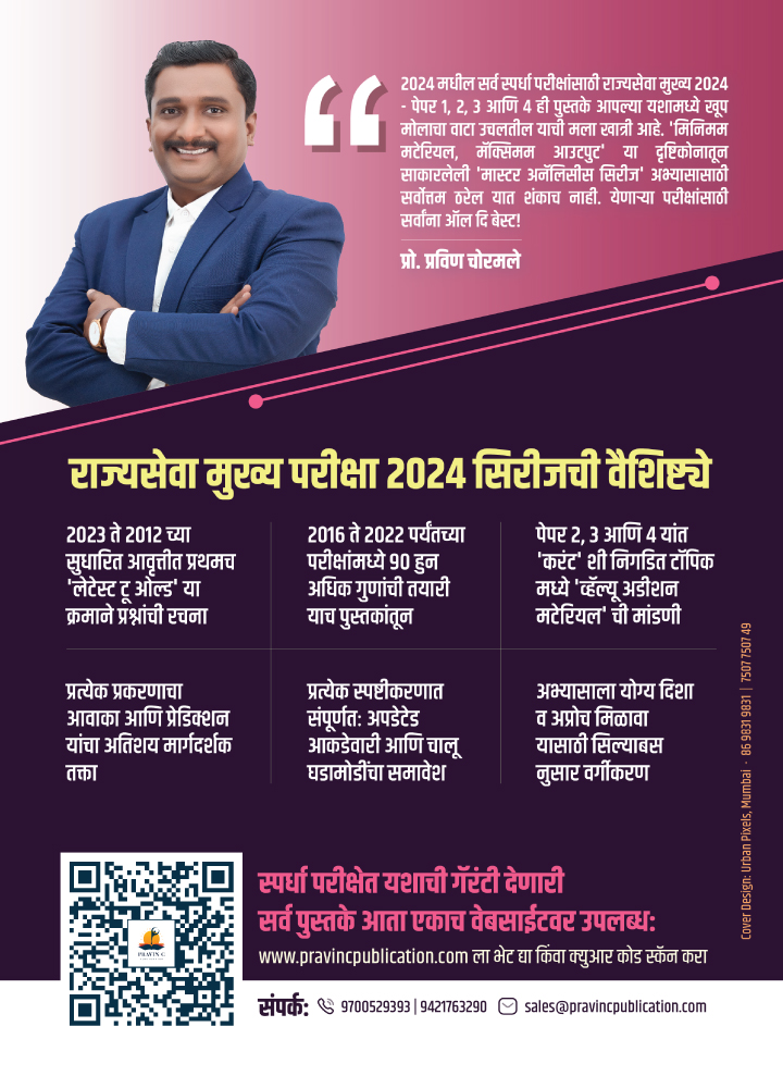 राज्यसेवा मुख्य परीक्षा ही सिरीज येणाऱ्या सर्व स्पर्धा परीक्षांसाठी उपयुक्त ठरेल या हेतूनेच तयार केली आहे. म्हणूनच सर्वाधिक अधिकाऱ्यांनी व विद्यार्थ्यांनी नावाजलेली अशी ही महाराष्ट्रातील एकमेव सिरीज आहे. विशेष म्हणजे 2016 ते 2022 पर्यंतच्या परीक्षांमध्ये 90 हुन अधिक गुणांची तयारी याच पुस्तकांनी केली आहे. या आठव्या सुधारित आवृत्तीत संपूर्णतः अपडेटेड आकडेवारी आणि चालू घडामोडींचा समावेश केला आहे. अभ्यासाला योग्य दिशा व अप्रोच मिळावा यासाठी सिल्याबस नुसार वर्गीकरण केले आहे. तसेच, प्रत्येक प्रकरणाचा आवाका आणि प्रेडिक्शन यांचा अतिशय मार्गदर्शक तक्ता सुद्धा दिला आहे.