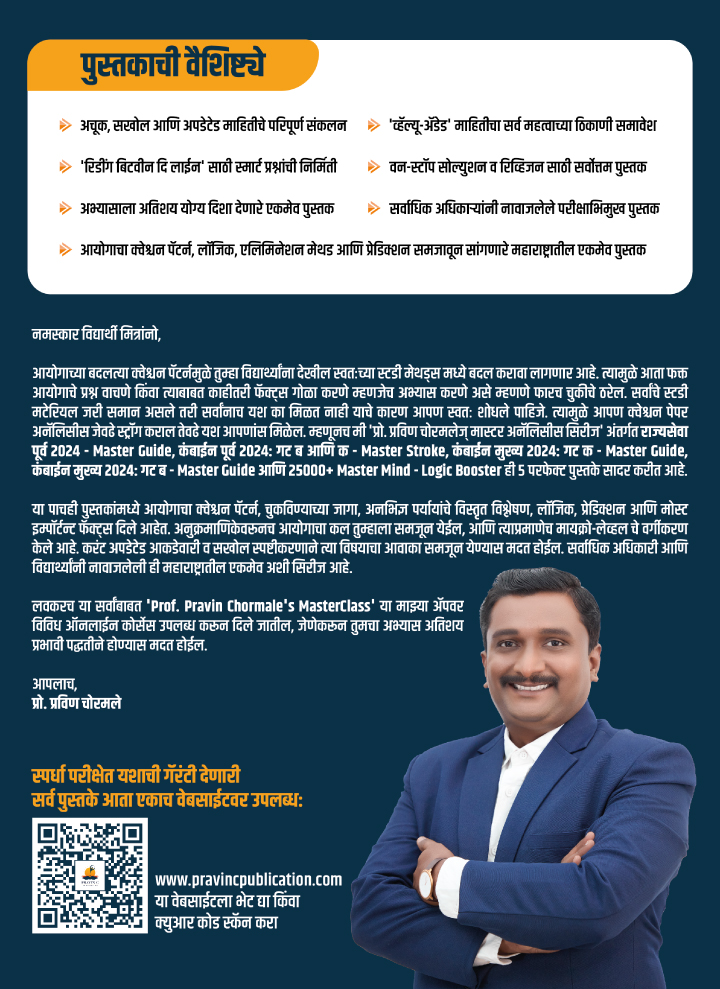 या आठव्या सुधारित आवृत्तीत आयोगाचा क्वेश्चन पॅटर्न, चुकविण्याच्या जागा, अनभिज्ञ पर्यायांचे विस्तृत विश्लेषण, लॉजिक, प्रेडिक्शन आणि मोस्ट इम्पॉर्टन्ट फॅक्ट्स दिले आहेत. अनुक्रमाणिकेवरूनच आयोगाचा कल तुम्हाला समजून येईल, आणि त्याप्रमाणेच मायक्रो-लेव्हल चे वर्गीकरण केले आहे. करंट अपडेटेड आकडेवारी व सखोल स्पष्टीकरणाने त्या विषयाचा आवाका समजून येण्यास मदत होईल. सर्वाधिक अधिकारी आणि विद्यार्थ्यांनी नावाजलेली ही महाराष्ट्रातील एकमेव अशी सिरीज आहे ज्यात क्वेश्चन पेपर अनॅलिसीस स्ट्रॉंग करण्यावर अधिकाधिक भर दिला आहे.
